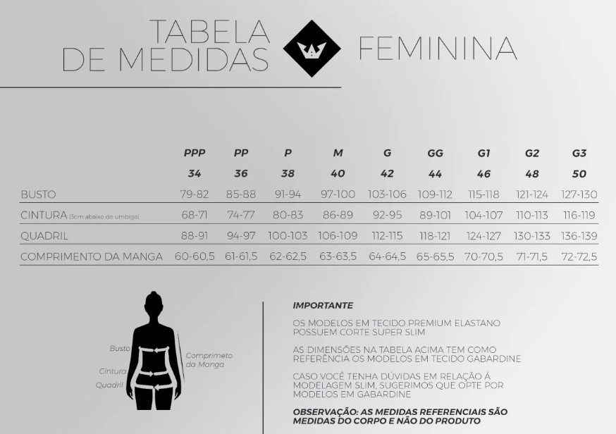 Possui fechamento em zíper, com cortes verticais que alongam a silhueta e modelagem slim que se ajusta ao corpo, oferecendo o máximo de conforto para o seu dia a dia.